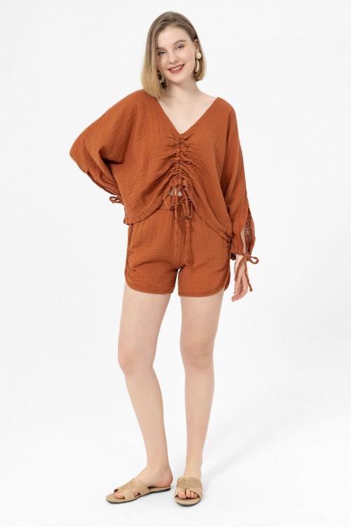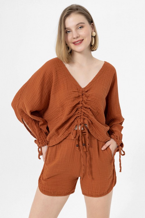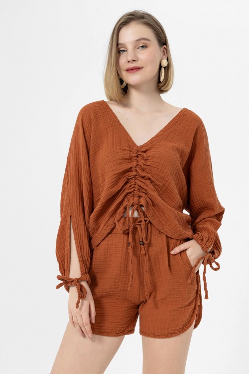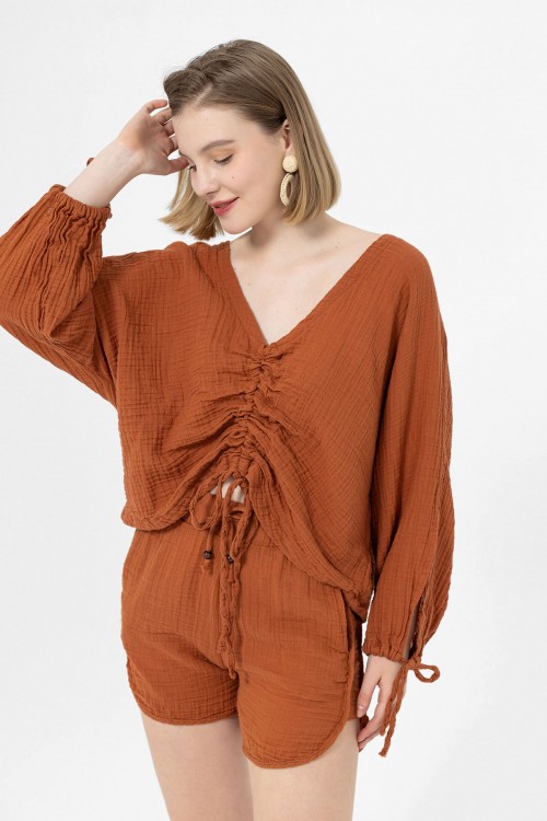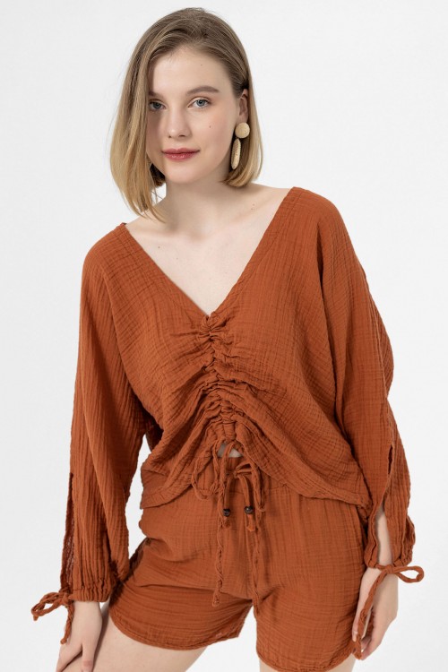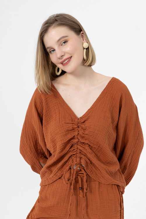 KADIN CROP/BLUZ - MÜSLİN UZUN KOLLU BÜZGÜLÜ KİREMİT - 1080