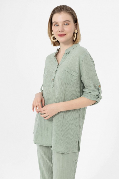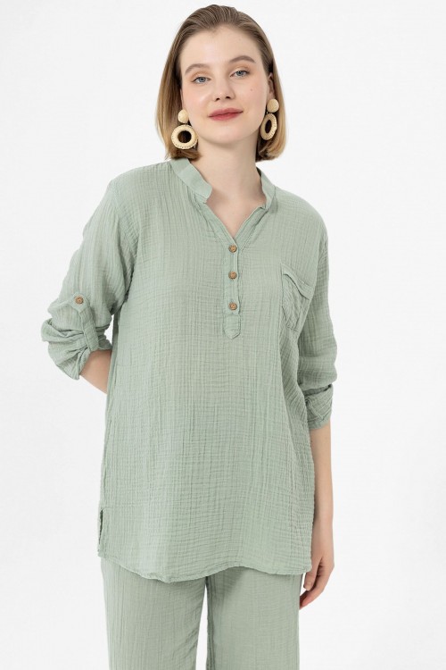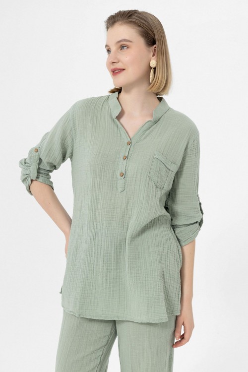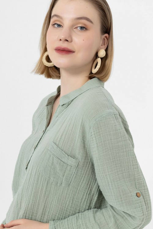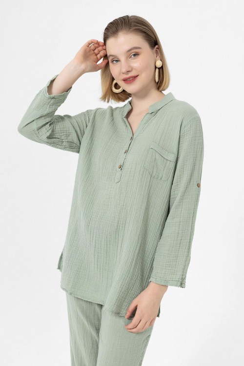 KADIN BLUZ - MÜSLİN HAKİM YAKA UZUN KOL BLUZ ÇAĞLA YEŞİLİ - 1100
