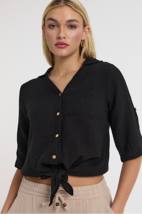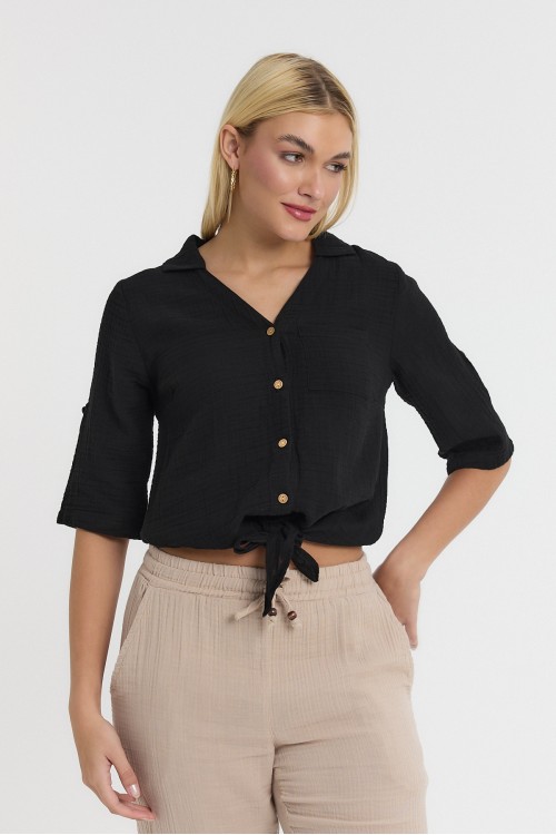 KADIN BLUZ - MÜSLİN ÖNDEN BAĞLAMALI SİYAH BLUZ - 1020