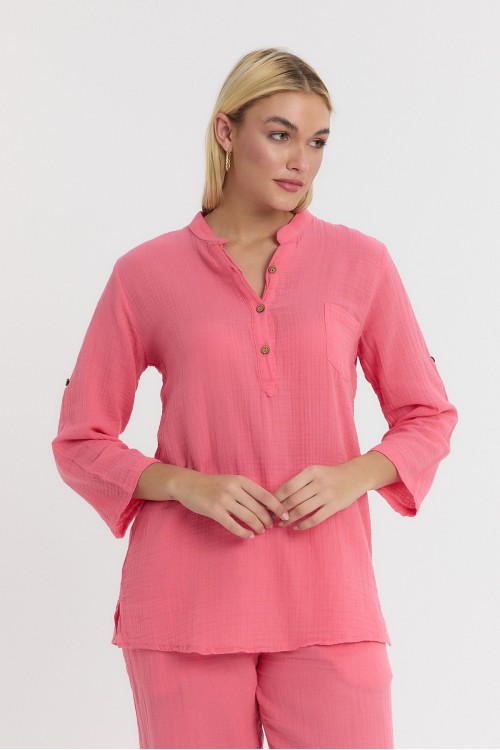 KADIN BLUZ - MÜSLİN HAKİM YAKA UZUN KOL BLUZ PEMBE - 1100