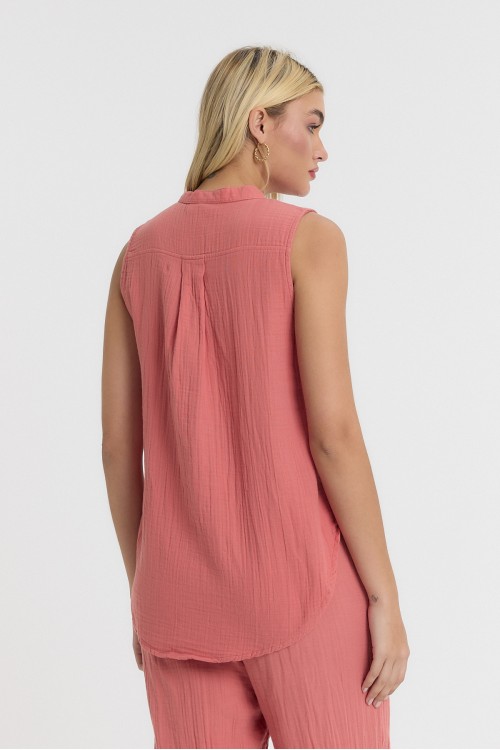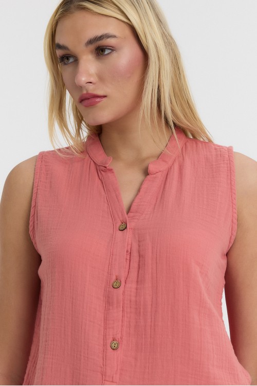 KADIN BLUZ - MÜSLİN HAKİM YAKA YARIM PAT KOLSUZ BLUZ GÜL KURUSU - 1070