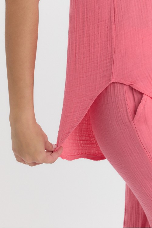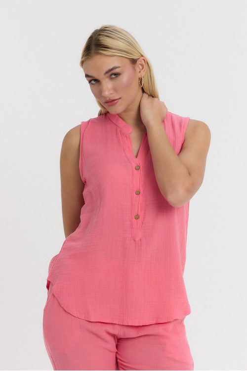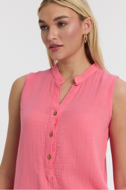KADIN BLUZ - MÜSLİN HAKİM YAKA YARIM PAT KOLSUZ BLUZ PEMBE - 1070