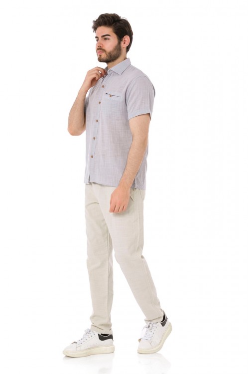 Erkek Yakalı Kısa Kollu Keten Gömlek Gri -4510
