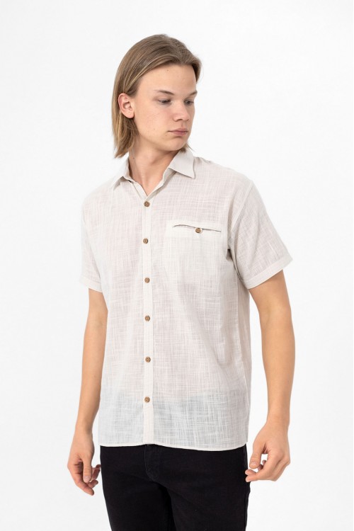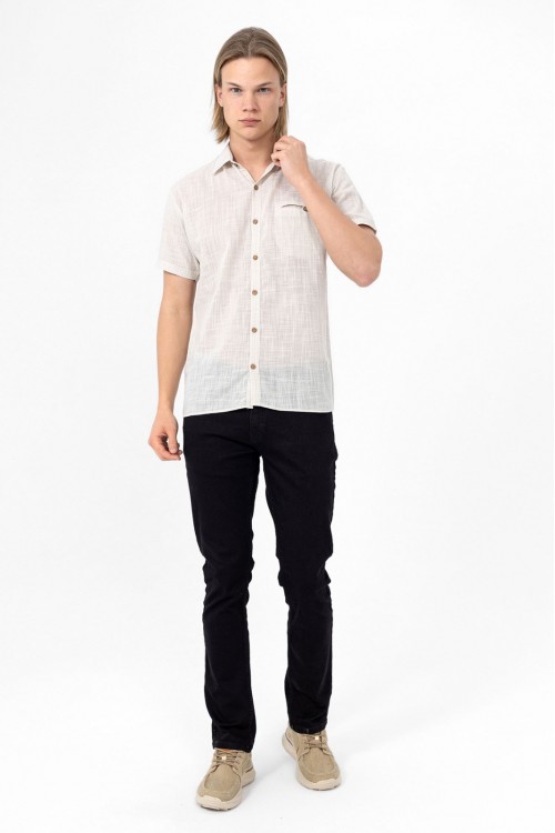 Erkek Yakalı Kısa Kollu Keten Gömlek Krem -4510