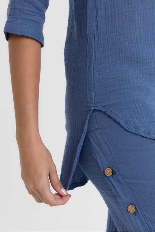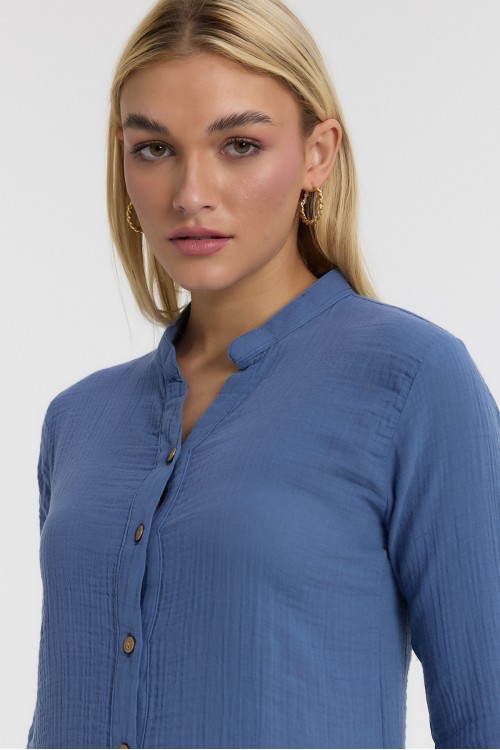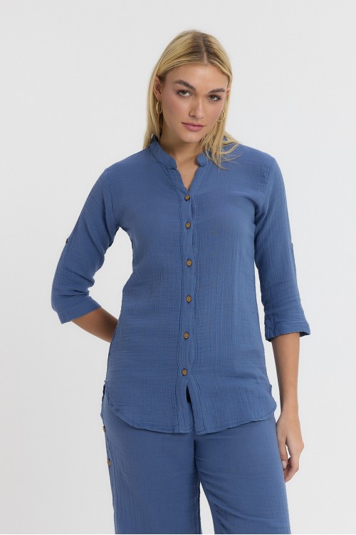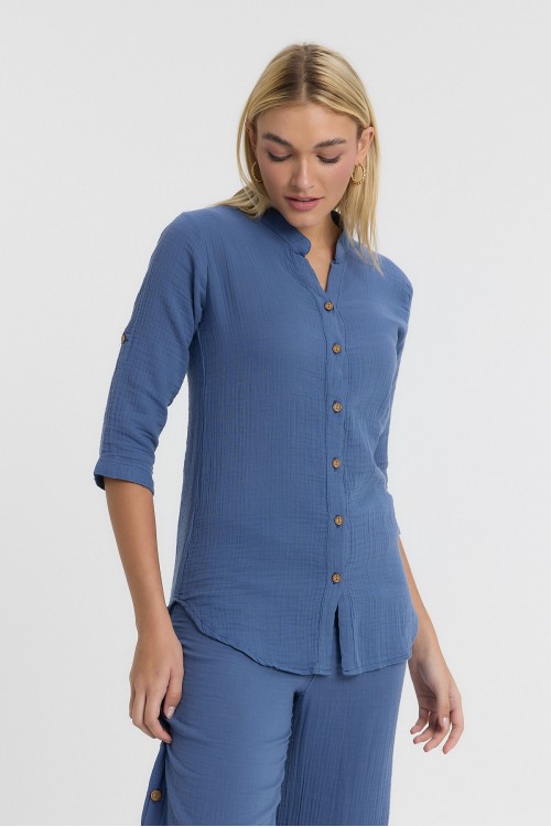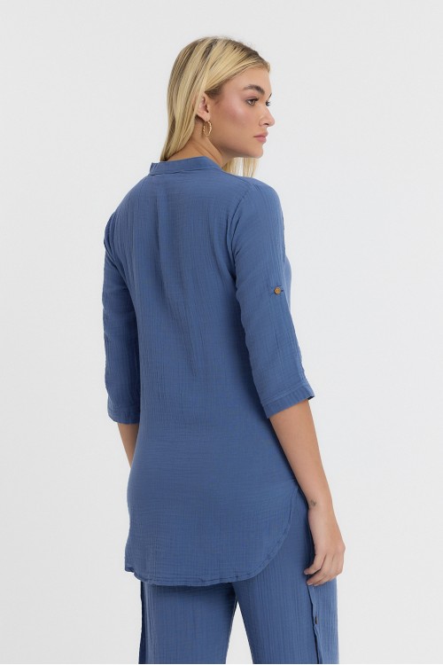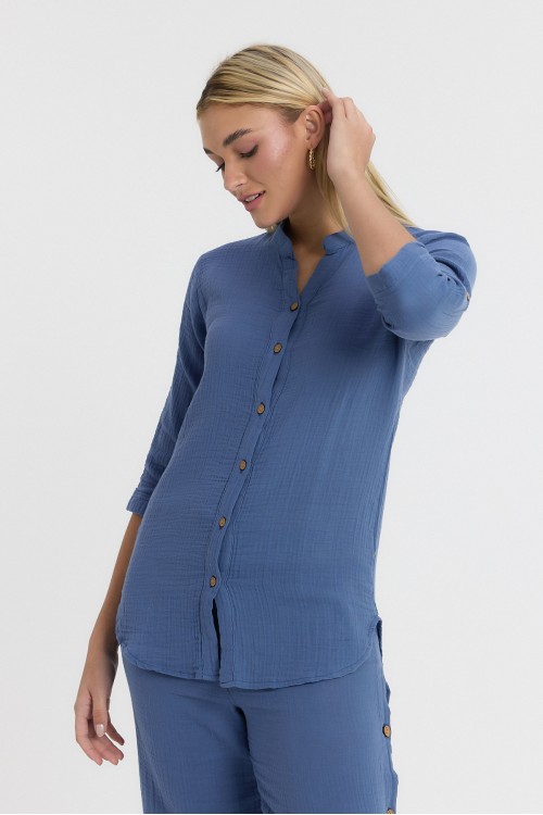 KADIN GÖMLEK - MÜSLİN HAKİM YAKA PETROL MAVİ UZUN KOL GÖMLEK - 1010