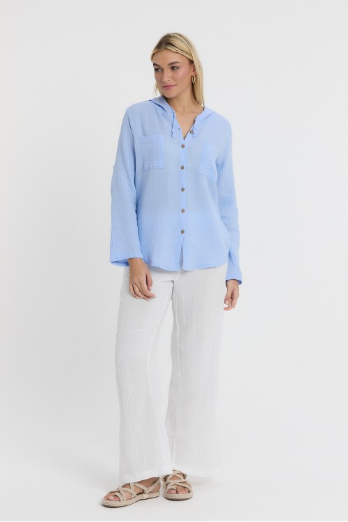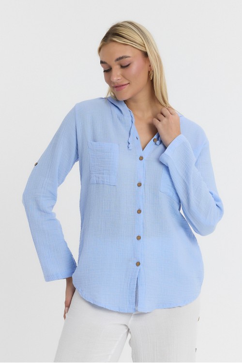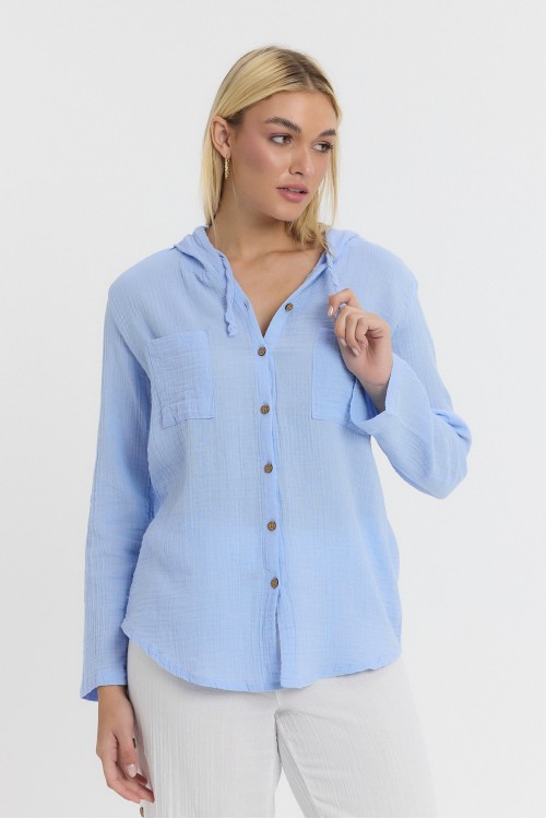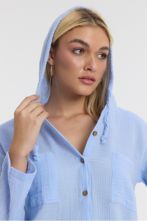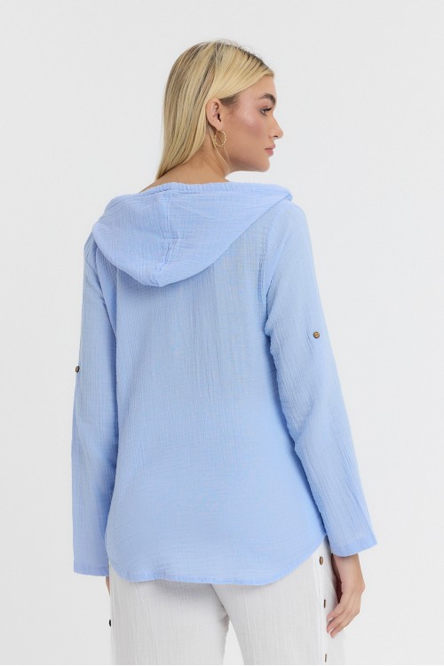 KADIN GÖMLEK - MÜSLİN KAPÜŞONLU MAVİ BEYAZ GÖMLEK - 1030