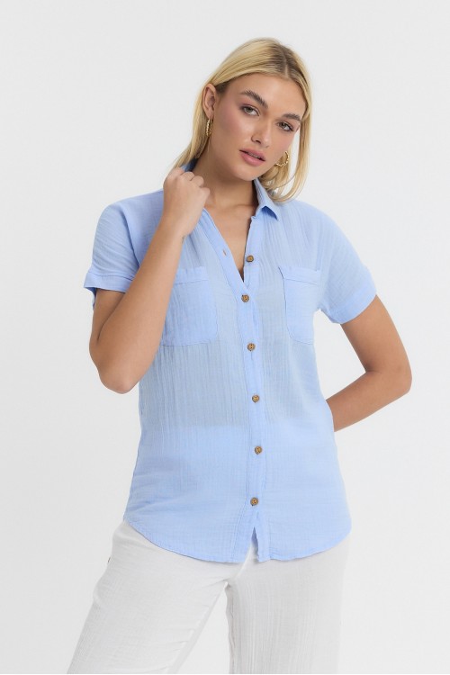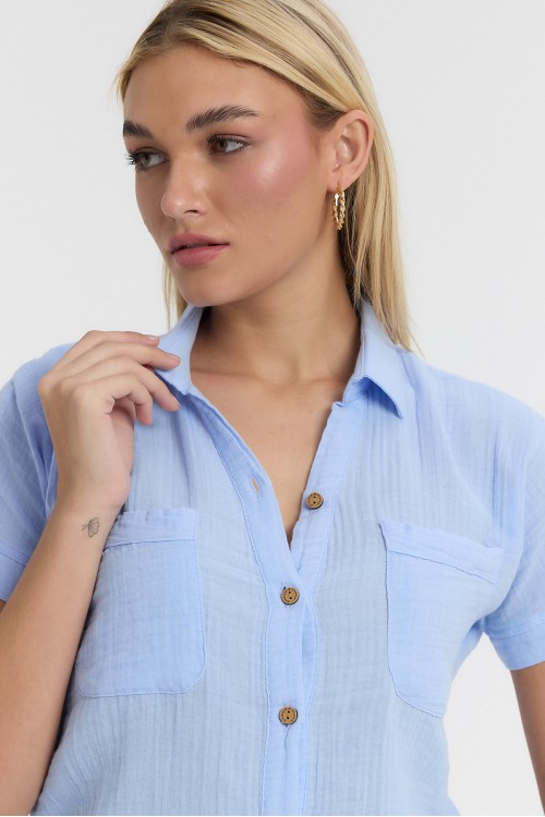 Kadın Müslin Yakalı Kısa Kol Çift Cepli Mavi Gömlek