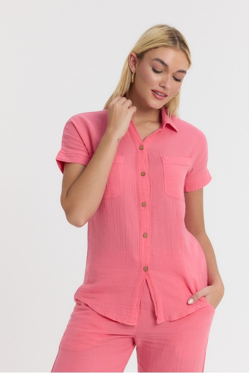 Kadın Müslin Yakalı Kısa Kol Çift Cepli Pembe Gömlek