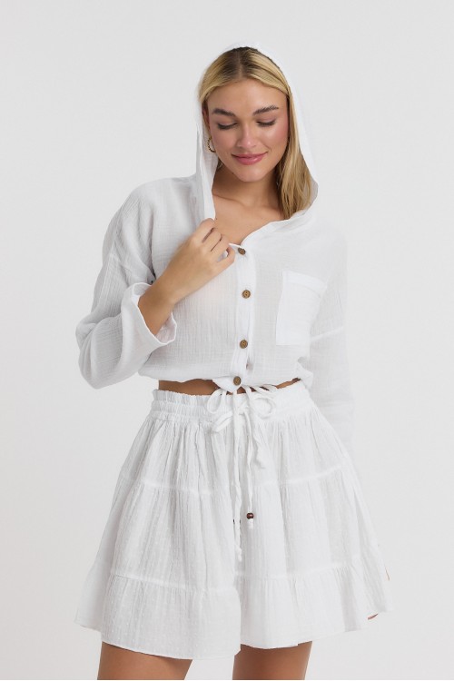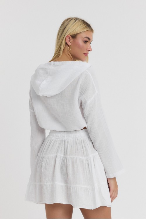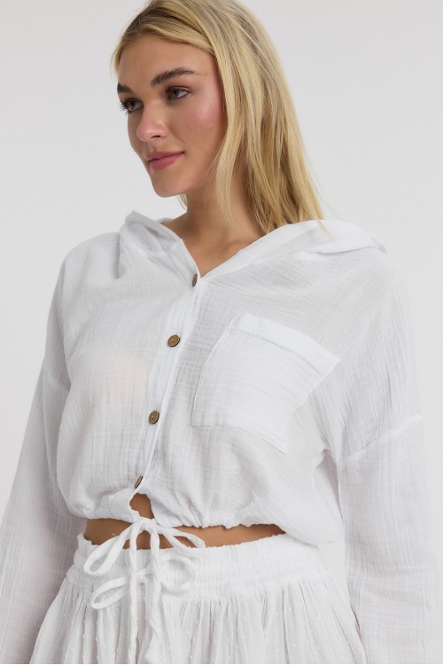 BEYAZ MÜSLİN KAPÜŞONLU DÜĞMELİ UZUN KOL CROP- 1160