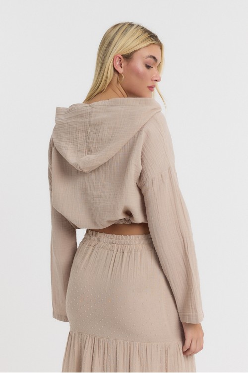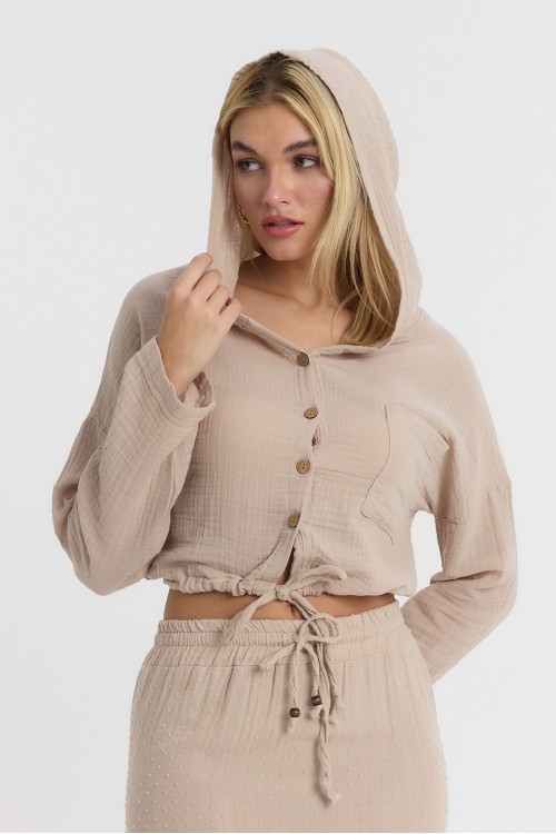 KREM MÜSLİN KAPÜŞONLU DÜĞMELİ UZUN KOL CROP-1160
