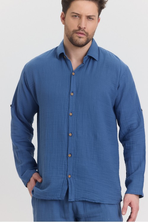 LACİVERT MÜSLİN YAKALI UZUN KOL GÖMLEK -4030