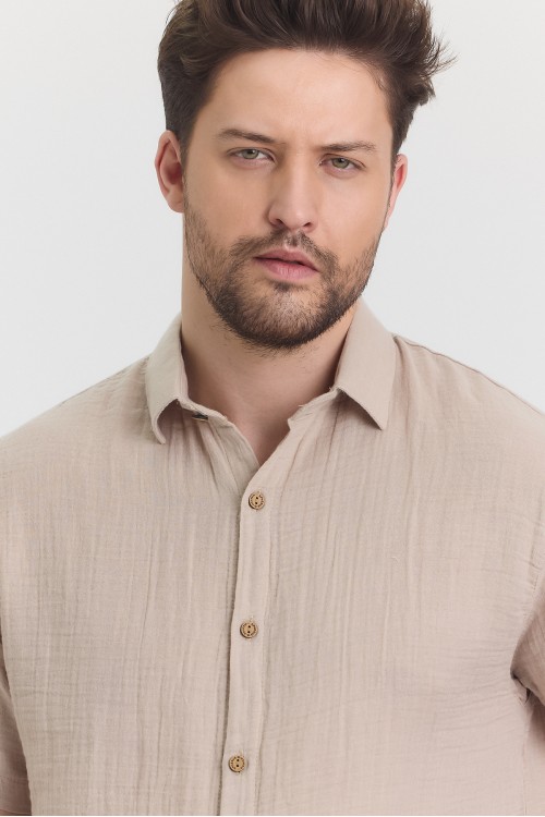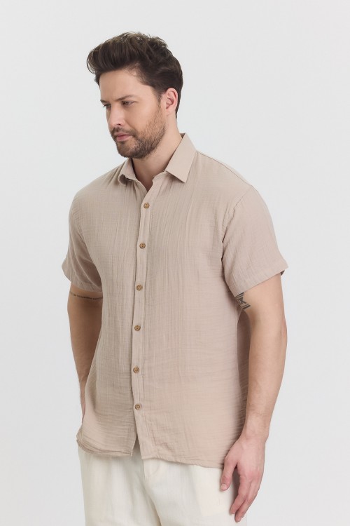 Erkek Müslin Yakalı Kısa Kol Krem Gömlek