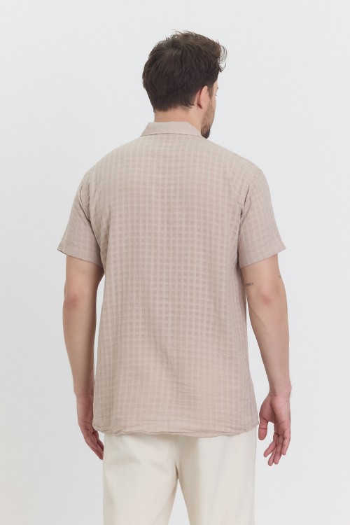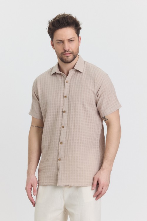 MÜSLİN TOPRAK / KREM WAFFLE YAKALI KISA KOL GÖMLEK -4045